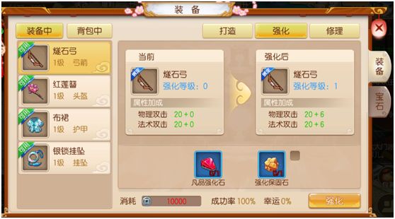 强化装备:提升战力的重要途径。可消耗材料打造装备,打造的装备比刷怪拾取的属性值会更好。可消耗凡品强化石或者强化保固石对装备进行强化,强化后装备的属性加成会大大提升。可消耗银币对装备进行修理,修理后装备的耐久度会提高。
