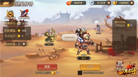 过五关,斩六将,玩家可以带领自己的将领挑战一个个对手,不断超越自己和强化武将能力。