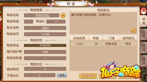 打开【帮派】-【信息】界面,帮派成员都可以查看帮派名称、等级、成员数量、资金等信息,还可以领取帮派分红、进行帮派捐献。如果玩家是帮主,可以发送帮派通知。