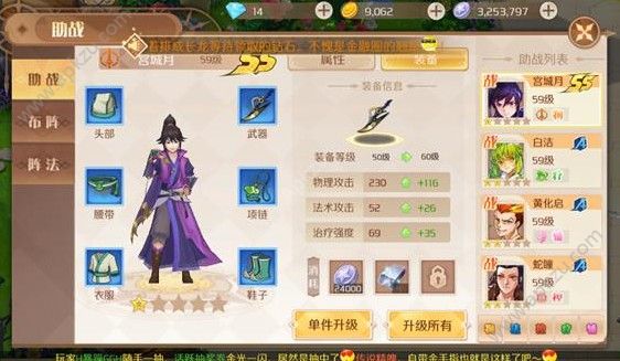 助战装备,每个助战拥有6件装备,为助战提供一定属性。助战装备每10级可消耗银币、精铁石进行提升装备等级。