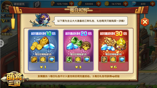 每日礼包属于每天限购一次的低额度特价礼包,共有1、3、6元三个档位,都比较划算,尤其是6元档,能产出100体力,这在前期是十分重要的资源。