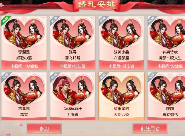 只要带着有缘的小伙伴在主界面点击“仙缘”-“前往月老”就可以约定婚姻了。不过空着手去可不行,记得带上988绑定元宝哦。