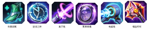 恢复战靴和逆流之钟保证前期可以频繁使用技能消耗敌人,后期用离子炮电磁炮等装备造成超高伤害。