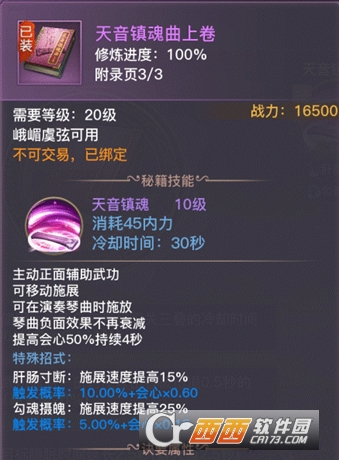 由于虞弦在释放技能对敌人控制之时,敌人受到控制的触发概率会降低,所以天音镇魂曲是必不可少的一本秘籍,不仅能够提高会心概率,而且负面概率不再衰减,这样不仅能够大幅度的减少技能持续时间,并且能够在琴曲释放之时释放该技能,很少技能可以做到这样。