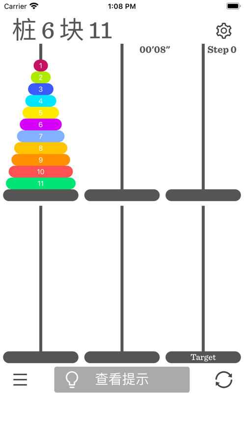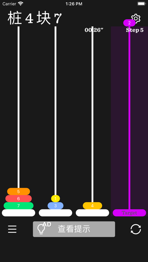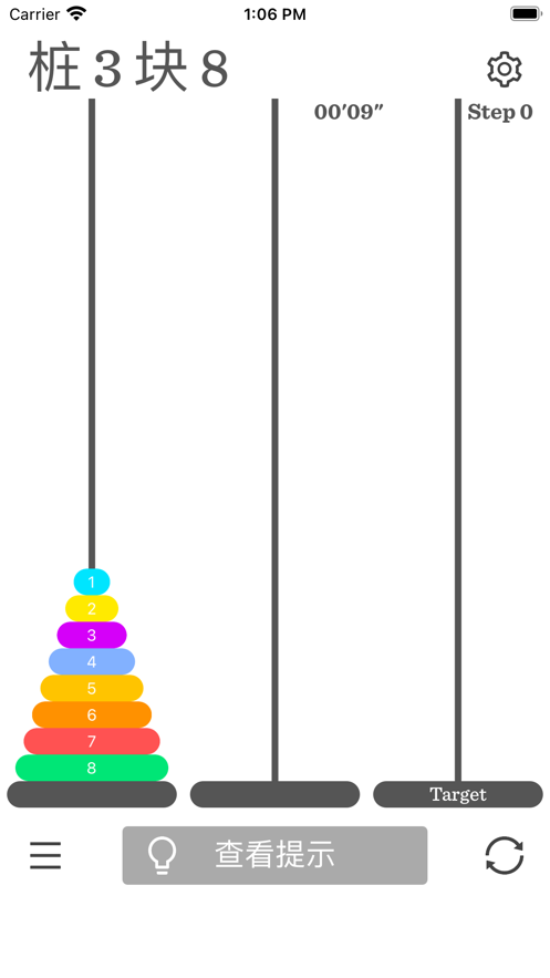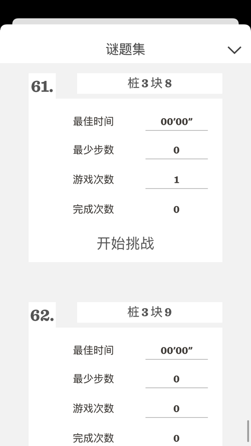 3. 我们提供了62个不同难度的游戏规则,从3桩3块一直到3桩8块,也提供了8桩22块等。