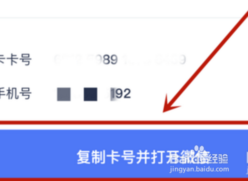 4、点击微信支付之后,出现以下图中所示页面,我们将卡号复制上,并打开微信。