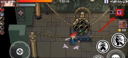 1、首先合成台就是上图所示的建筑,由四个铁链子固定。注意合成台属于地图上随机刷新的房间,大家只需要观察右上角的小地图,当出现【紫色边框+三黑点】的图标时,这个房间内必有合成台。