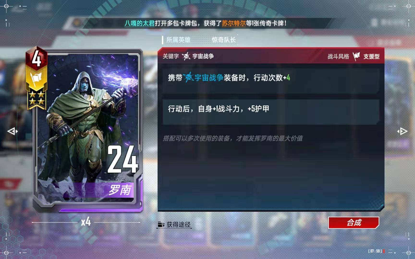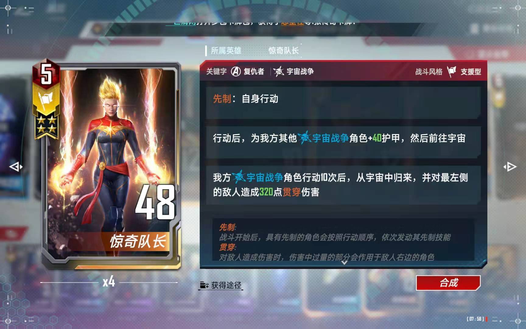 这张卡是主要的终结手段,最少需要两张,四星是群体打320,非常恐怖。