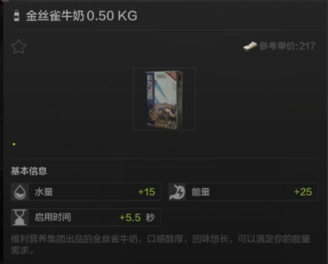 这个牛奶饮用后水量加15,能量加25,启用时长是5.5秒。