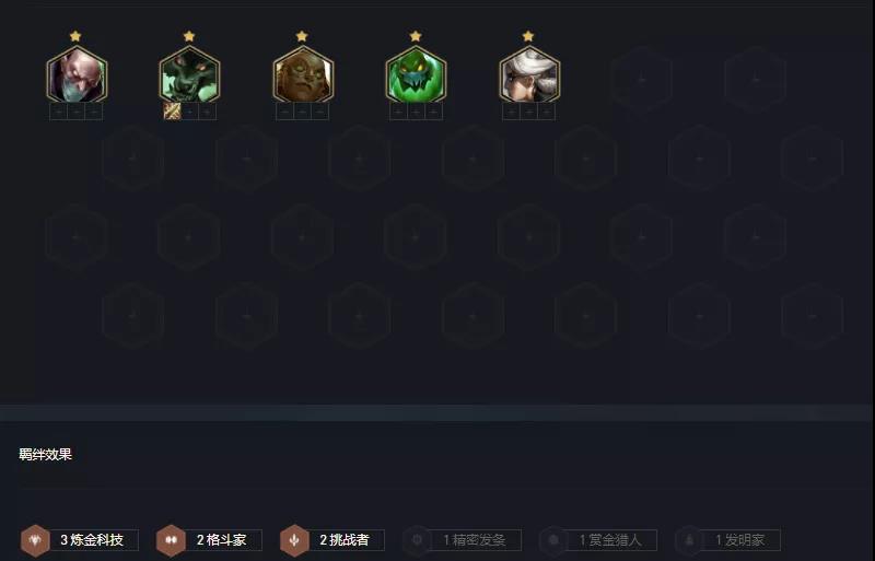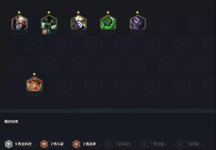 阵容这时候有5炼金+2挑战就优。如果没有蒙多可考虑3炼金+4挑战。阵容大部分棋子2星或有蒙多后再下卡蜜尔否则坦度不够。