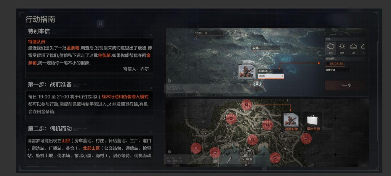 秘密任务已经结束,追捕行动将于12月10日19:00-21:00开启,本次开放的地图为山谷和北部山区。