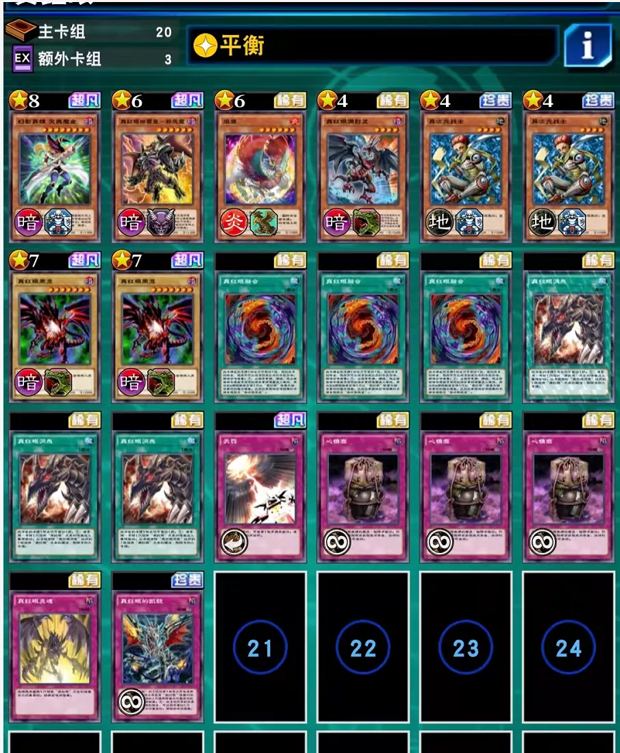 技能方面选择和常规真红眼一样的平衡技能,因为我们卡组高等级怪兽较多,为了避免手札事故求稳还是选择了866平衡,保证第一回合能稳定召唤出真红眼黑刃龙。