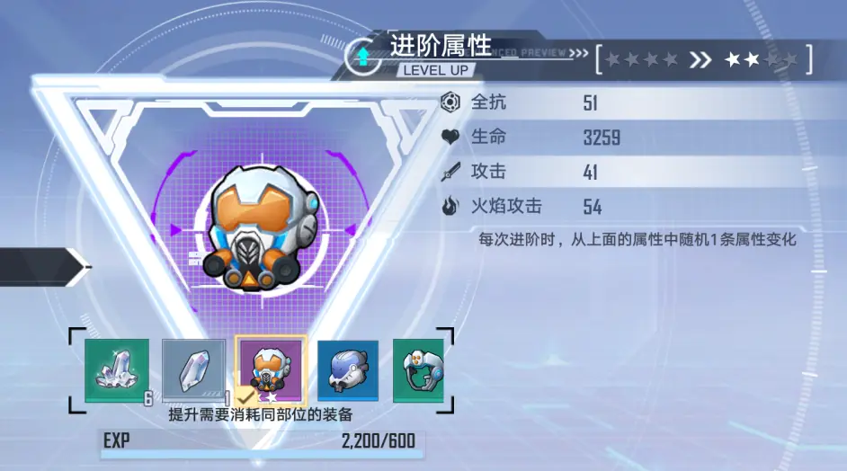 然后我们用已经进阶过的各星级装备作为狗粮进行测试,我在这里摆出两个测试装备。下图两件狗粮分别为正好3星的头盔,和多4点经验的1星护手。从图中可以看出3星头盔价值2200经验,根据之前我们所知道的信息,一件3星装备进阶需要2250经验,紫装本身价值400经验。