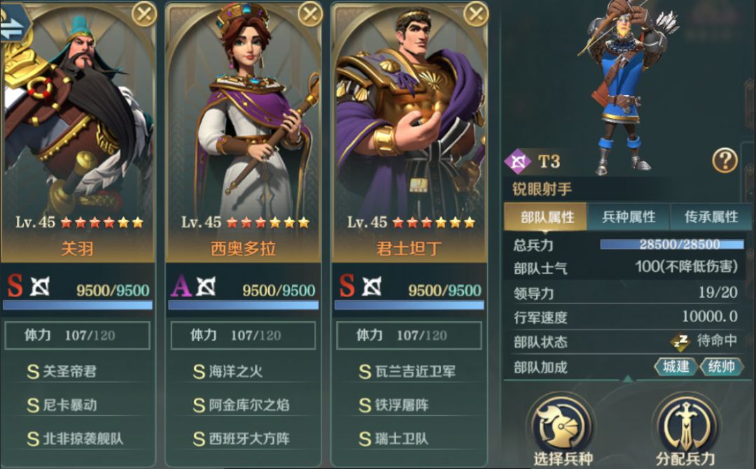君士坦丁吸收伤害为主,同时携带铁浮屠阵,增加关羽输出的稳定性,瑞士卫队补充禁疗和变相给关羽增伤。