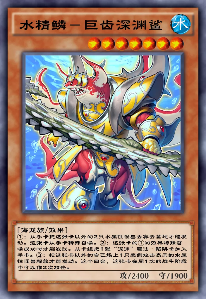 丢弃手牌中两只水属性怪兽,就可以从手牌特殊召唤此卡,以此方法特殊召唤成功时还可将卡组中的「深渊」魔法·陷阱卡加入手牌。