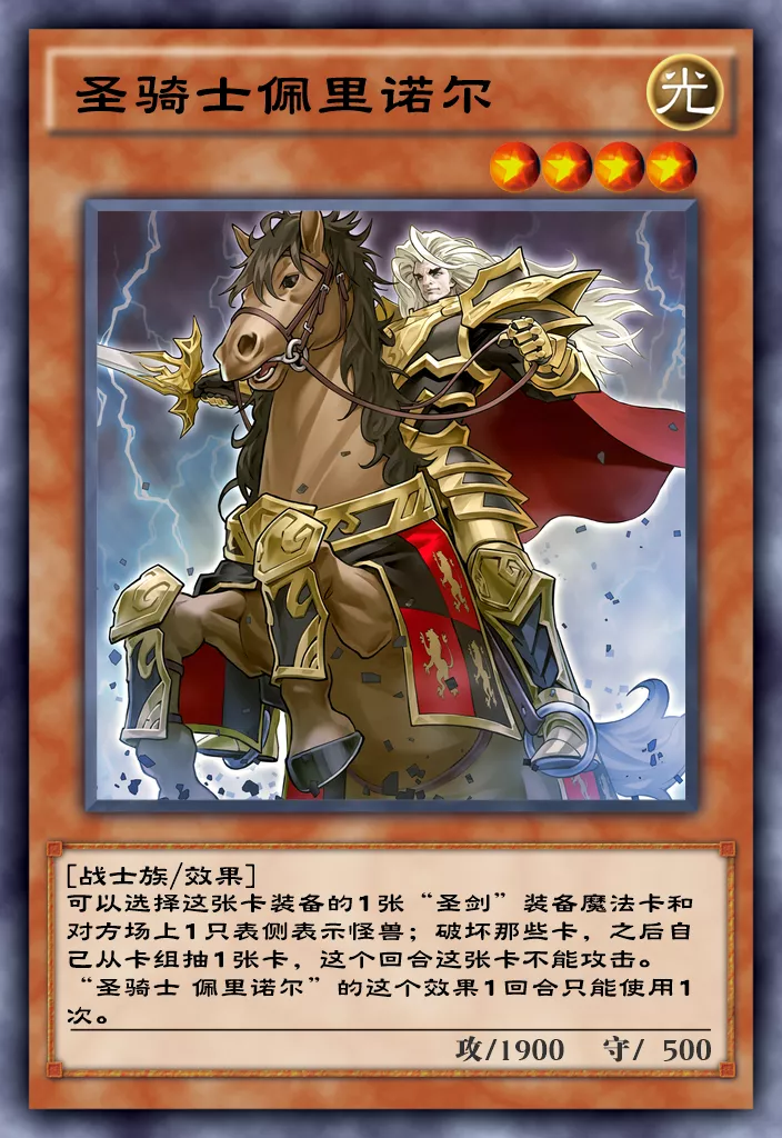 以一次攻击为代价,直接破坏了对手的强力怪兽并抽1张卡。不使用效果时,拥有1900高攻击力的「圣骑士佩里诺尔」也不会轻易倒下!