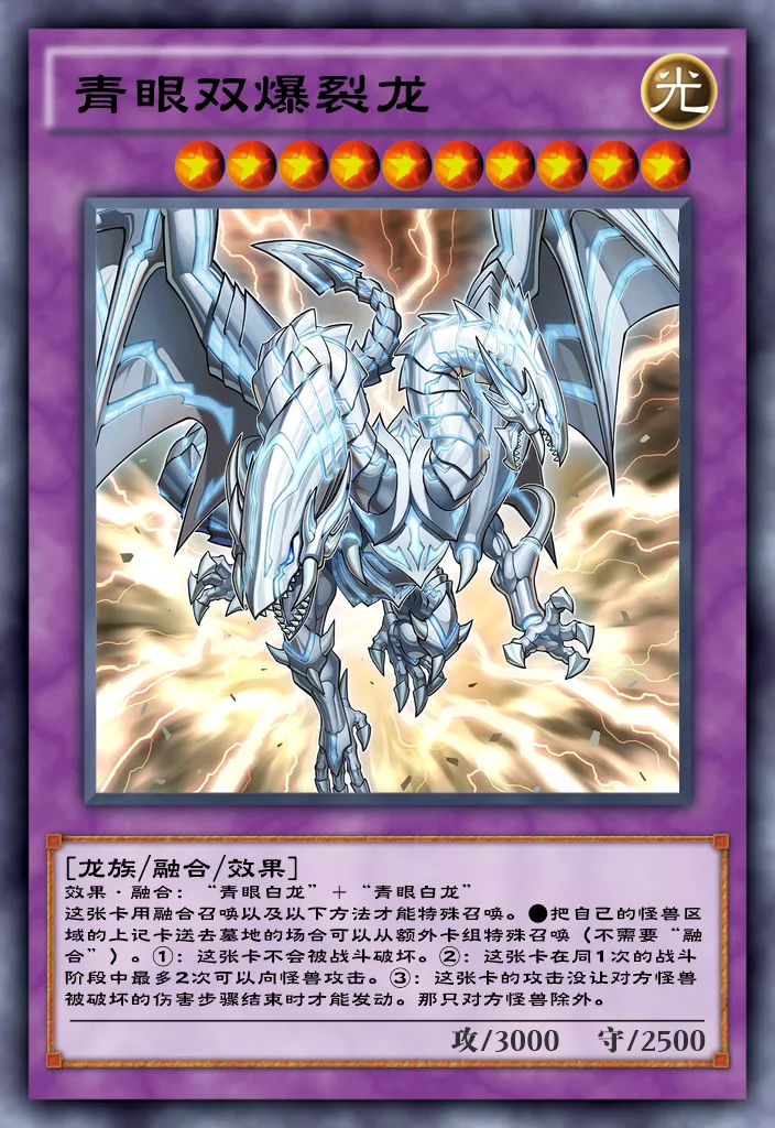 此卡既可以通过融合特殊召唤,也可以通过将怪兽区的两只「青眼白龙」送入墓地来特殊召唤。