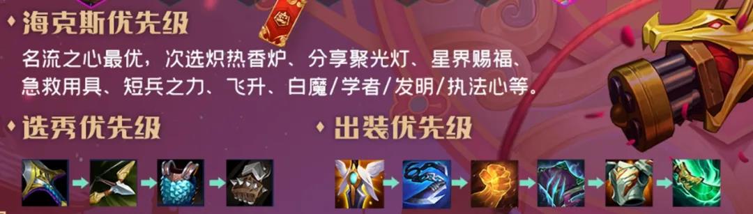 海克斯强化选择:名流之心最优,可开3名流羁绊,这样剑姬输出续航能力会大大加强。次选炽热香炉、分享聚光灯、星界赐福、急救用具、短兵之力、飞升、白魔/学者/发明/执法心等。
