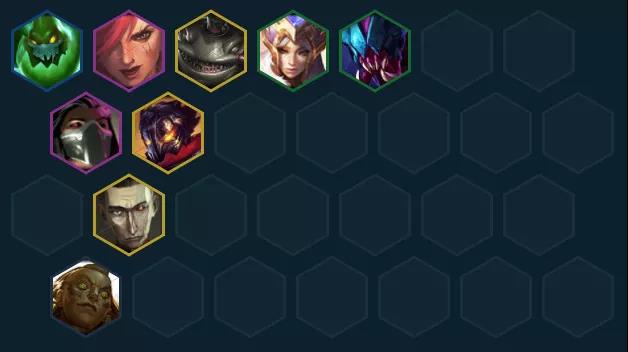 过渡推荐:卡萨丁+挖掘机+猪妹+乌鸦+蚂蚱组成3变异2格斗2黑魔2海克斯,带3变异的蚂蚱前期带鬼书非常厉害,这套过渡稍微有点质量就能进入连胜。