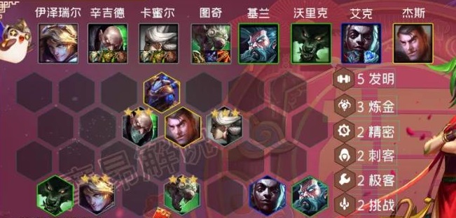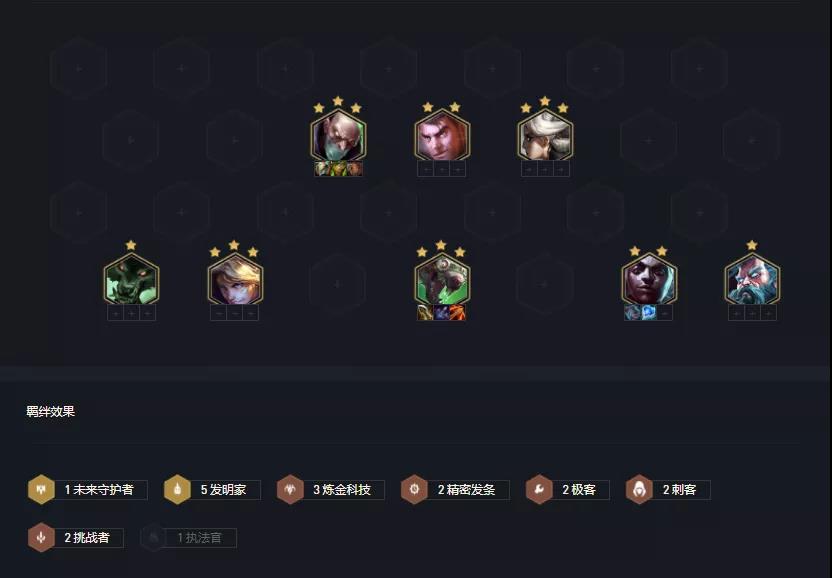 之后就可攒钱准备升级7-8人口,7人口不多做停留,快速追到8人口,搜卡找到杰斯开5发明羁绊。杰斯没来之前可考虑用萨勒芬妮代替。