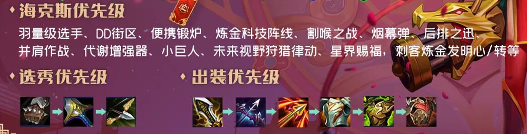 海克斯:羽量级选手、DD街区、便携锻炉、炼金科技阵线、割喉之战、烟幕弹最优。