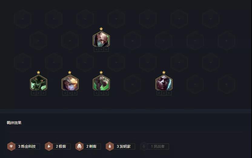 赌老鼠在上赛季就是强势的低费赌狗阵容,而这赛季由于艾克变为发明家羁绊,赌老鼠在8人口就能开出5发明,强度与上赛季相比大大增强。这套阵容还有一个思路就是抛弃5发明羁绊,上3发明+4刺(螳螂+3星魔腾),但测试中强度没有5发明强度高,更是没有发明螳螂强度高,大家选择时候须谨慎。