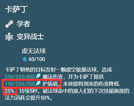 (1)卡萨丁技能造成魔法伤害同时,还能够提供护盾值,保证卡萨丁有续航能力;