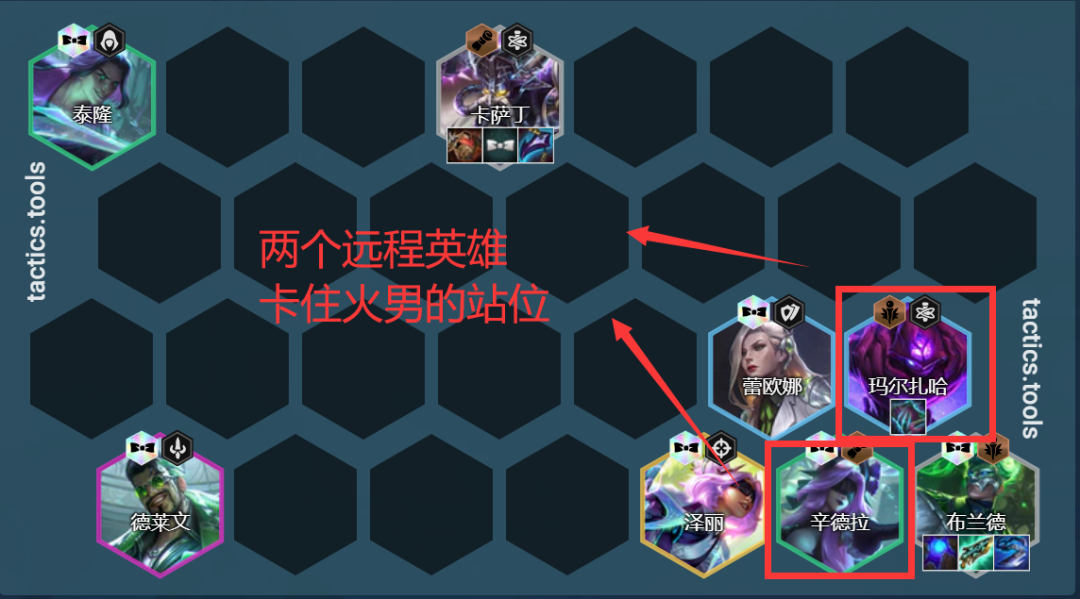 (1)辛德拉和马尔扎哈如果是对角线站位,后期两个英雄可能会走动,从而火男也会跑出来;