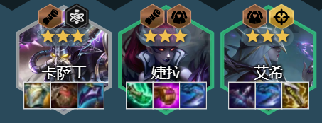 3阶段:3-1回合直接去大搜3星卡萨丁和艾希,优先追3星卡萨丁。玩法思路跟之前版本的【圣盾大嘴】类似,前排的质量对于这个阵容非常重要,阵容只有卡萨丁一个前排,只有卡萨丁站的住,后排才能够稳定输出。