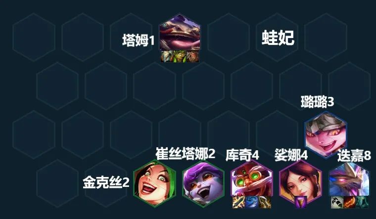 一费卡塔姆在这个阵容里终于是配吃防御装备了,石像鬼提供双抗配合狂徒铠甲撑血量,前期有日炎也可以做。