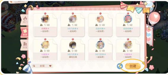 点击进入后,就可以看到目前正在举行的派对,奥比们可以看每个派对目前的参与人数和派对主题。而在点击右下角“创建”就可以举办属于小奥比们自己的派对了。