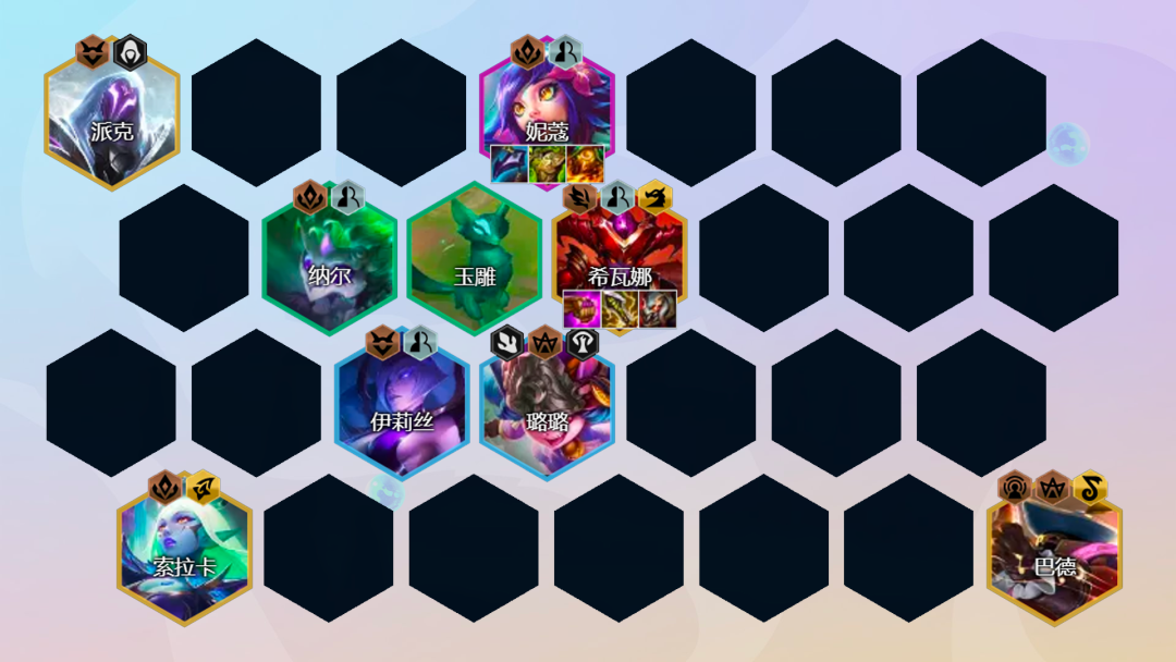 阵容组成:纳尔、璐璐、妮蔻、伊莉丝、希瓦娜、派克、索拉卡、巴德