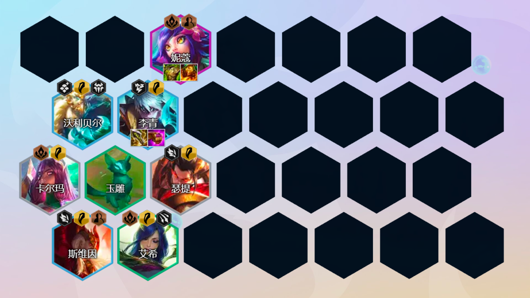 3阶段:3-2阶段拉6人口开6神龙,如果能够找到2星李青那么基本锁血。李青没有2星,前期还是优先拿2星卡尔玛打工过渡,李青1星血量太少即使加了6神龙羁绊也非常容易暴毙。