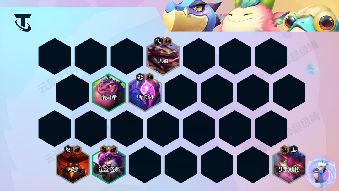阵容组成:黑默丁格、崔丝塔娜、璐璐、塞拉斯、娑娜、佐伊、赛芬、巴德
