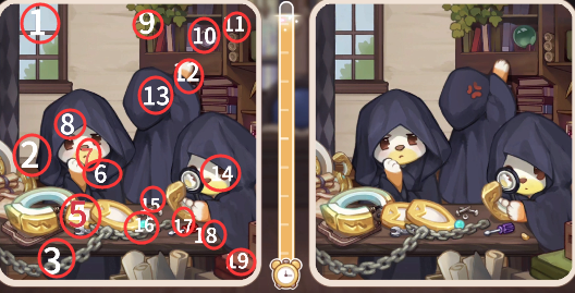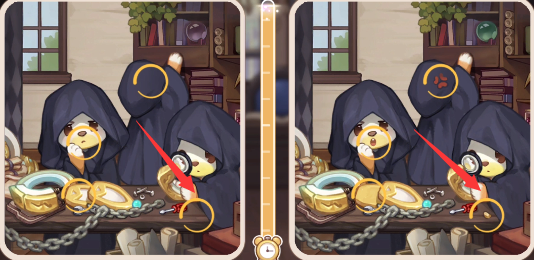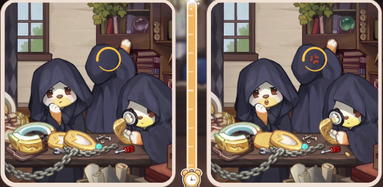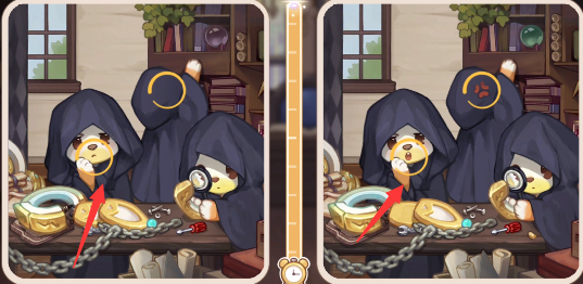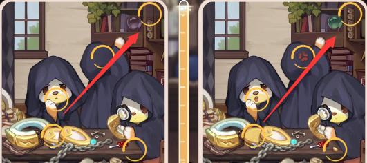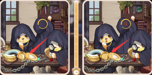 4、右下角桌子上的东西不一样,左图没有东西,右图多了一个金色的颗粒。