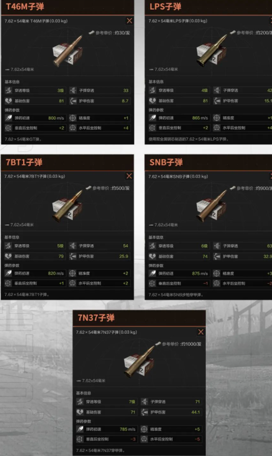 首先我们来了解一下今天测试对象的基础信息,目前7.62x54毫米口径的子弹共有5款,可适用于栓动步枪莫辛纳甘和射手步枪SVDS两把武器。它们的基础属性如下: