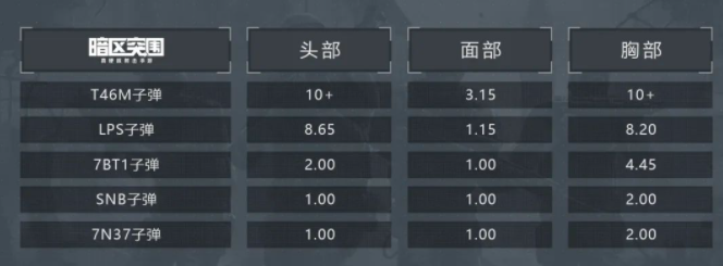 针对顶级防具时,高级子弹的优势更为明显。SNB子弹和7N37子弹的伤害表现并列第一,在攻击头部和4级防护的面部时都只需要一枪,胸部则为两枪。而5级穿透的7BT1子弹除了能稳定击穿面罩之外,攻击其他部位的效果则略显乏力。剩下的T46M子弹和LPS子弹由于难以穿透防具,效果都不太理想。