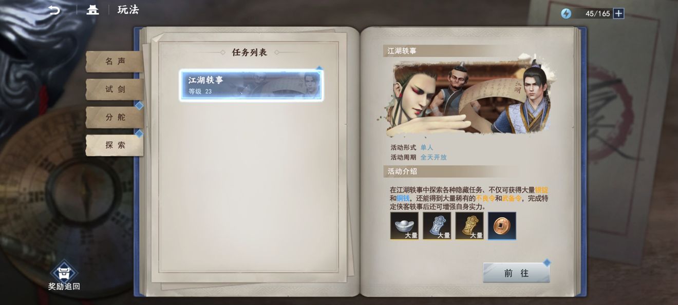 不同的侠客,轶事任务也不同,那李星云为例,需要拥有李星云,陆林轩,张子凡和姬如雪,我没有姬如雪这个没法完成是不可抗力,而下面那个任务只需要8个无名秘籍,我们可以查看它的获取途径