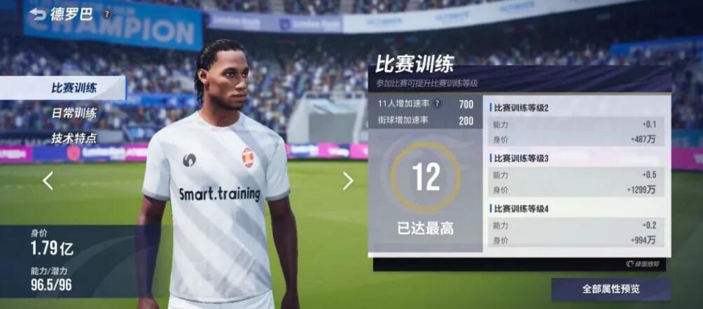 1.通过参加比赛,可以提升比赛训练等级,进而为球员带来一定的属性增益,当比赛训练等级达到12级(满)时,可为该球员带来全属性+3的增益;