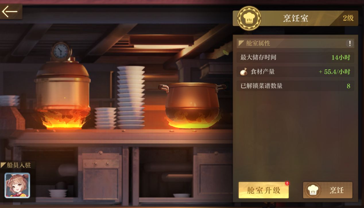 烹饪室:通过挂机可以产出食材,食材可以烹饪出英雄升级道具及提升角色默契道具。