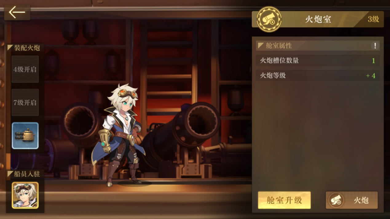 火炮室:可以通过升级来提升火炮系统的等级、和火炮槽位数量。火炮的升级材料可以在商城购买。