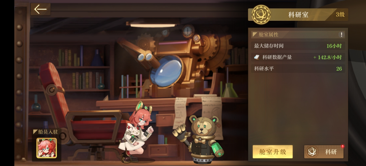 科研室:随科研室等级提升可解锁不同科研技能,闯关可携带1主动技能,1被动技能。