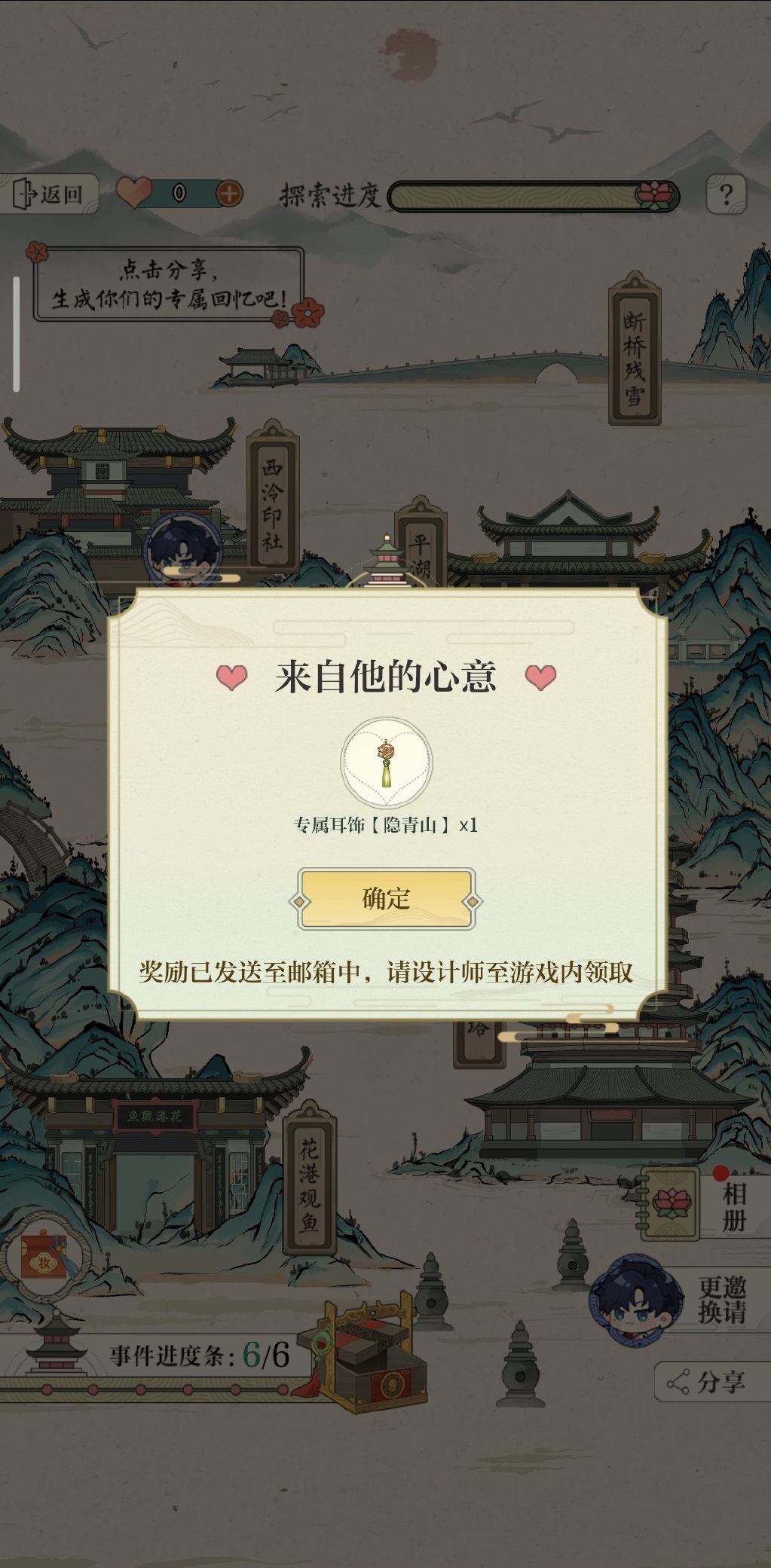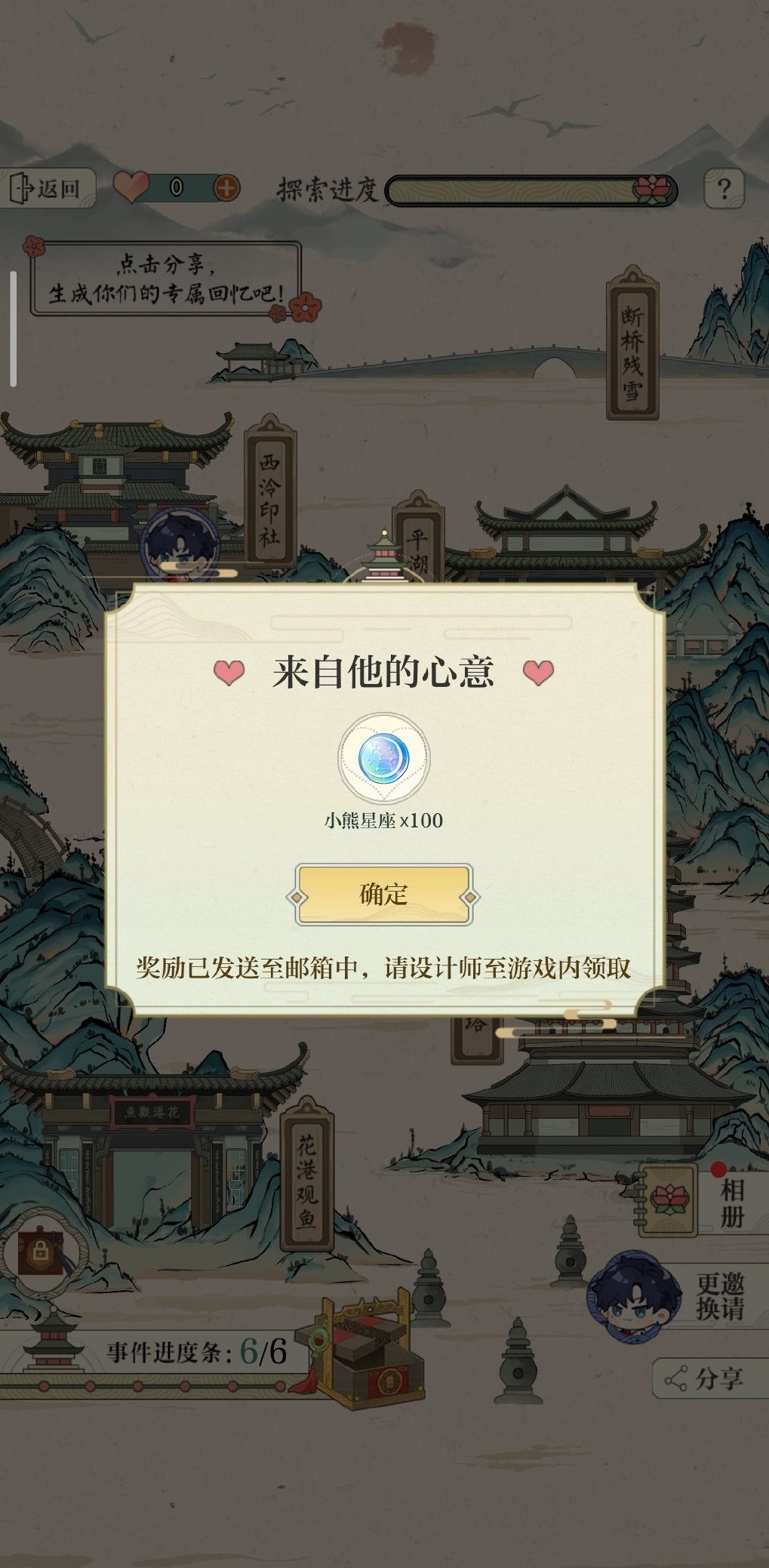 1、选择男主→选择地点→每日一次机会+扫码两次→和男主同游获取剧情→每个地方可以获得10小熊,五个男主总计300小熊→一个男主六个地点全部开完可获得100小熊和饰品【隐青山】。