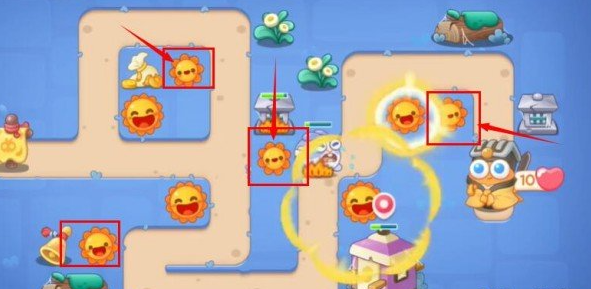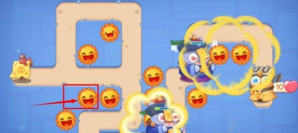 7、第七波中间加满级太阳花,具体炮塔如下图。