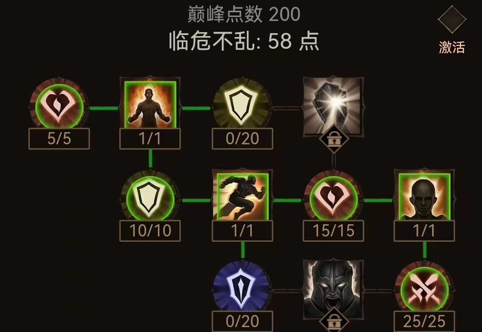 在临危不乱中获得500点永久伤害属性、永久4000生命值和永久120护甲,通过秘技获取坚韧不屈、畅通无阻、格挡和第六感效果。