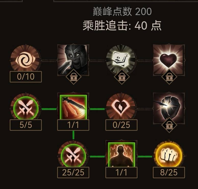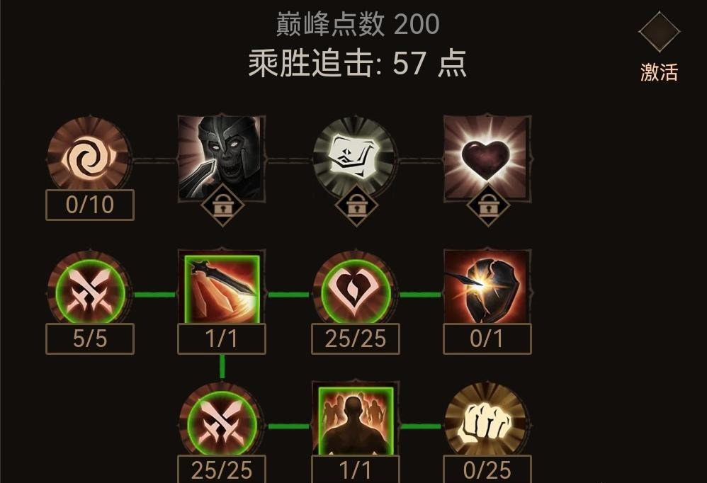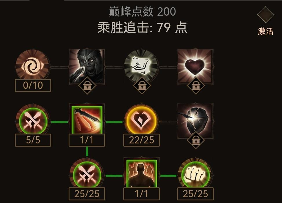 此方案加点,在乘胜追击中获得600点永久伤害属性、永久5000点生命值,通过勾选秘技获取狂热和浩劫效果。