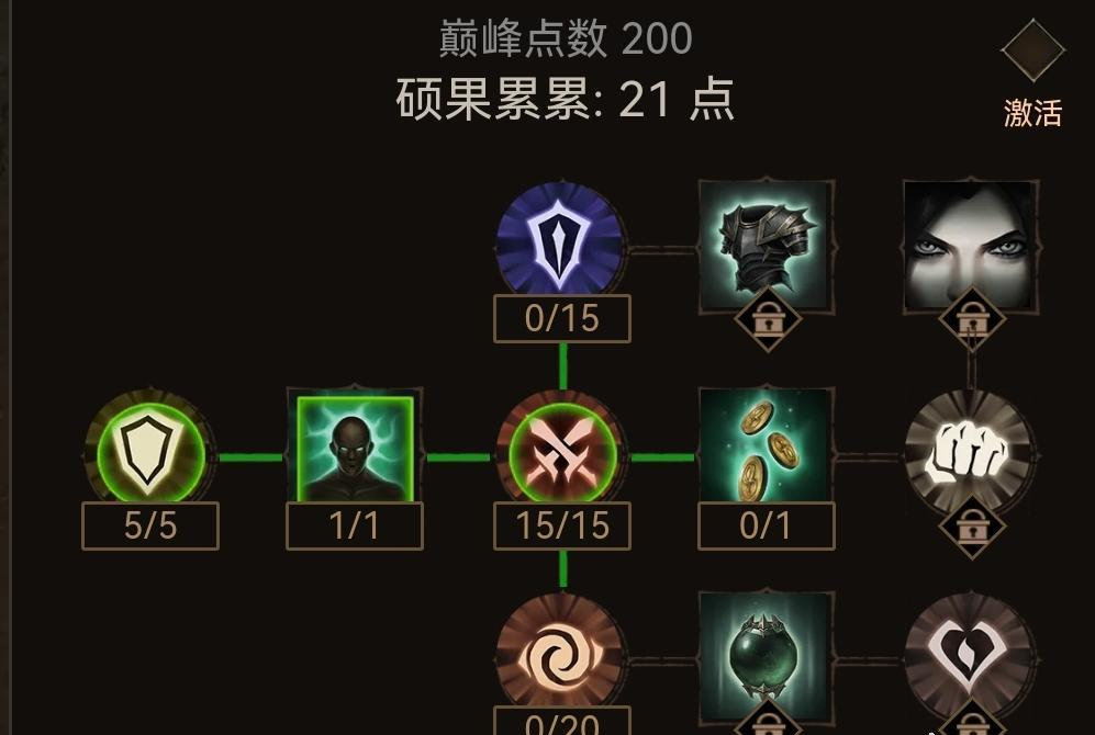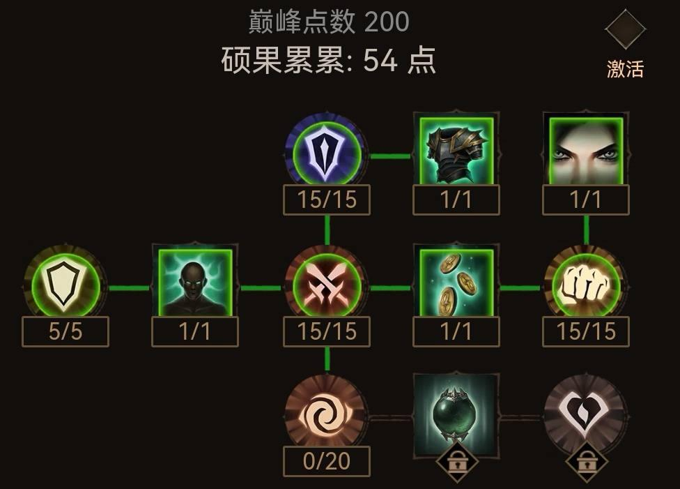 在硕果累累中获得300点永久伤害属性,永久20点护甲属性、60控制抗性和60破甲,通过勾选秘技获取苦练、点金、神赐和专注效果。