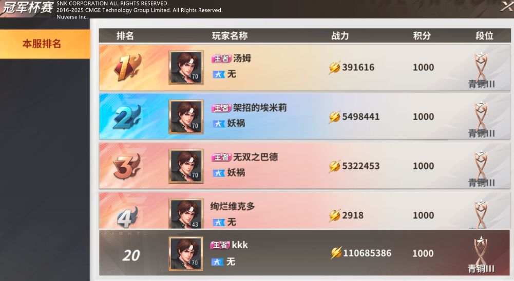 “格斗竞技”模式,经纪人自行挑选对手,可以刷新五次,挑战十次,根据击败的敌人,来提升排名,低排名大多是AI,难度较低,很容易打,但是奖励非常丰厚,可以获得大量钻石,俗“挖矿”。争取到排名之后,在晚上22:00还会发放排名奖励,荣誉与徽记,可以在竞技商店中兑换专属道具。