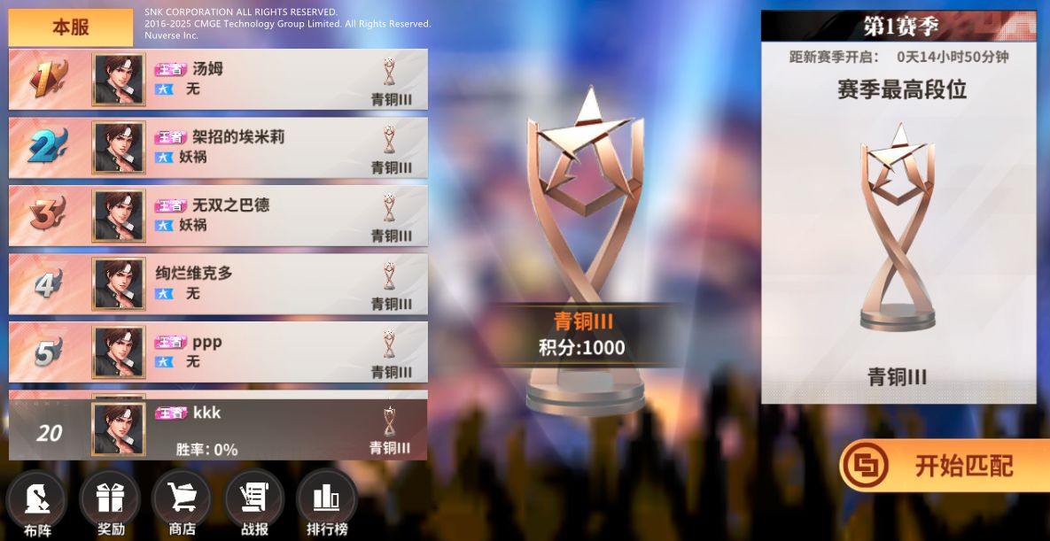 匹配机制的季度比赛,随机匹配对手,分为7个段位,青铜III~青铜I,白银,黄金,铂金,初始为青铜III,然后慢慢积累积分往上打,每次的段位提升都可以获得钻石与量子星屑或不稳定熔核,而当经纪人在赛季结束前冲上第一名,成为冠军,则可以获得专属“霸者”头像框,SSR格斗家碎片自选箱等稀有道具。