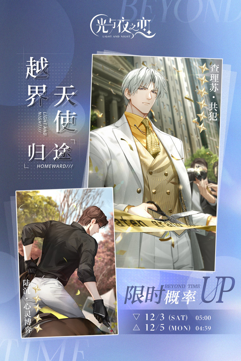 2活动说明:活动期间,信使花园将开启限时复刻概率UP【越界天使/归途】,光夜变奏第14章灵犀 [6星]灵犀 查理苏・共犯、[5星]灵犀 陆沉・心灵博弈 将限时加入卡池并获得概率UP。